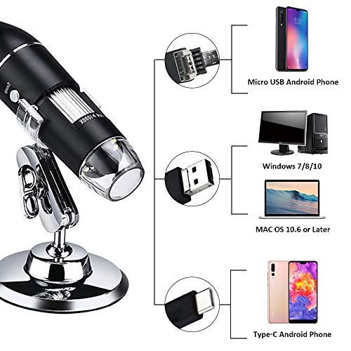 3 in 1 USB & Micro USB &Type-C Digital Microscope 1600X Magnification Camera 8 LEDs with Stand Compatible with Android Windows/XP Win 7 8 10 Vista Linux Mac Portable Handheld Inspection Magnifier
