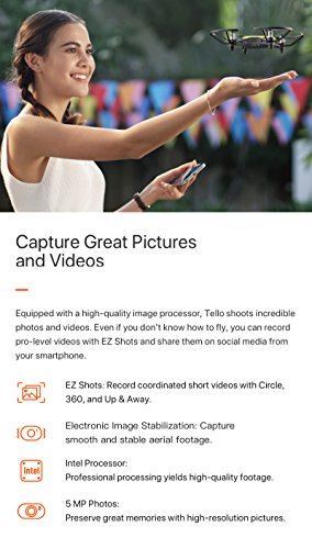 Equipped with a high-quality image processor, the Tello drone shoots incredible photos and videos. Even if you don’t know how to fly, you can record pro-level videos with EZ Shots and share them on social media from your smartphone. Camera features 5MP (2592×1936) photos and HD720 videos at a maximum flight time of 13 minutes.