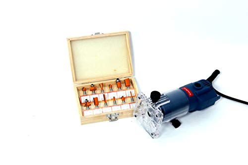 -Powerful router machine with 12pcs router bit set.&Free extra collet -The Right Rotary Cutter For Wood, Plastic Sheeting, Wood Veneer and Other Similar Materials Chamfering, Grooving, Surface Finishing, Curve Cutting, Planing Wood Edge, Pattern Processing Operations Activities. -Light body with strong power. Max. Cutting Diameter(mm) : 6.35