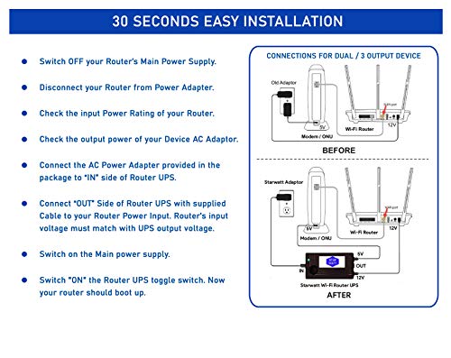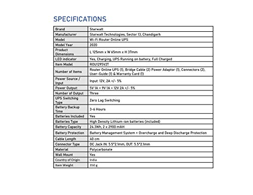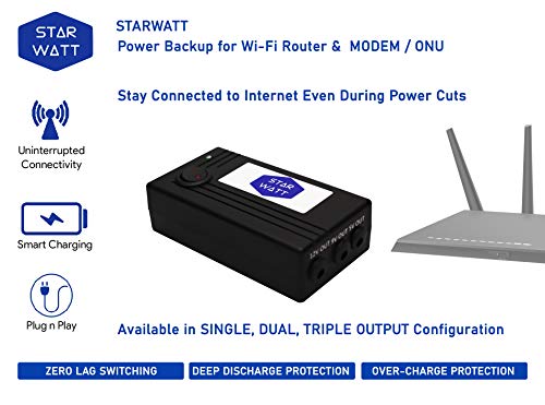 High Quality Polycarbonate Enclosure with Wall Mount design. Longer Cable length: It comes with 40 cm of Cable length. With the Starwatt Wi-Fi Router Online UPS for Wi-Fi Router, Stay connected to the Internet, even during power outages. The built-in power line detection circuit of Router UPS ensures switching between power line and battery without any delay which keep the device running during power cuts and switch over to generators.