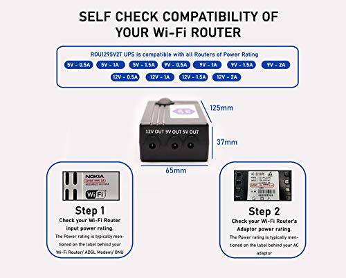 Quick installation with Plug and Play Design, Extremely light in weight and portable, Mini UPS for Wi-Fi Router comes with additional connectors that supports all Major DC Wi-Fi Routers. Contents in the box: Router Online UPS (1), Bridge Cable (2), Power Adaptor (1), Connectors (2), User-Guide (1) & Warranty Card (1).